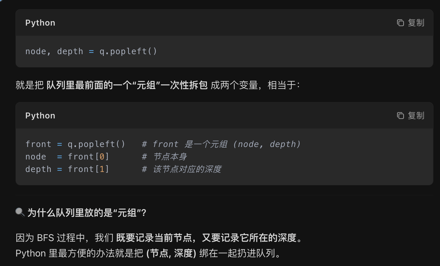 就是 一次性从队列里取出"节点"和"它对应的深度",省得再写两行赋值。相当于下面这个: