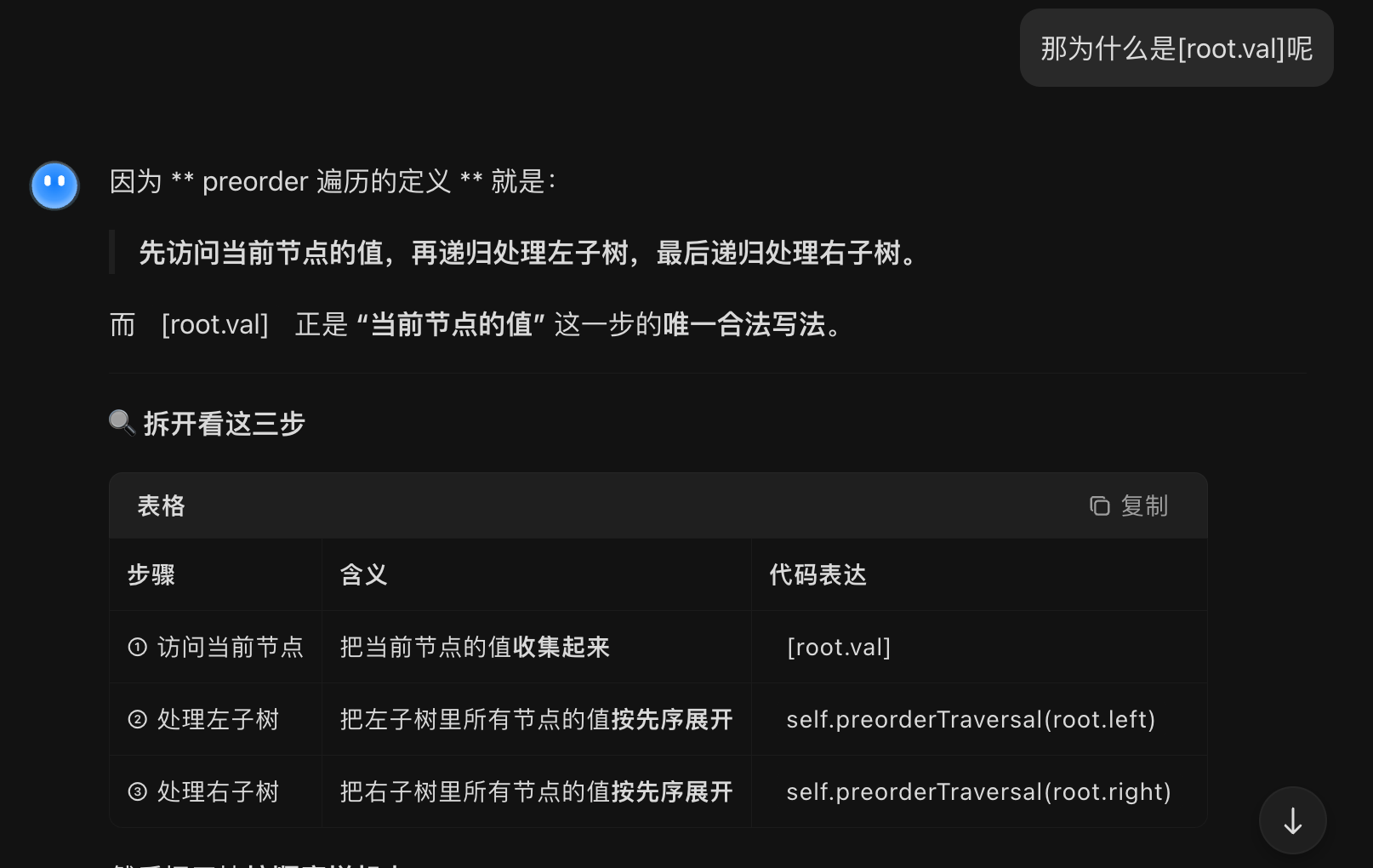 1、为什么是self.Traversal(root.right) 为什么不是self.Traversal(root.right.val)呢