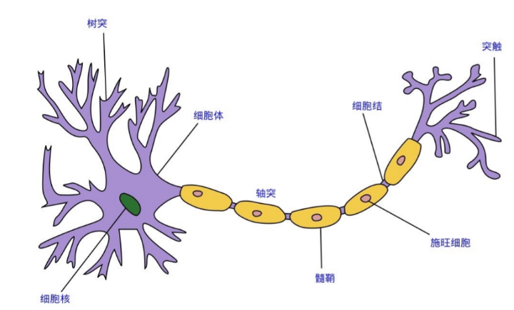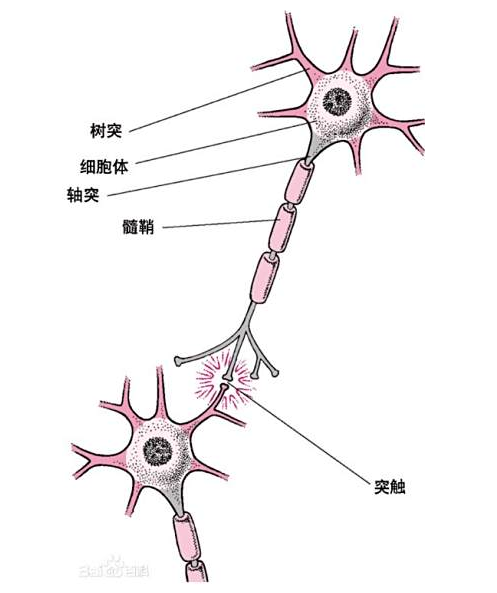 脑神经是由数以万计神经元连接组成的,中学时代我们都学习过生物,神经元主要由树突、胞体、轴突和突触组成。其中树突接收电信息,并将信号并传递至胞体,胞体承担信息整合功能,整合后如果需要进一步传递,就会通过轴突传递给下一个神经元,不同的神经元之间是通过突触连接的,如下图
