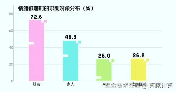 另一项由中国青年报社、中青校媒联合社交平台 Soul App 共同发起的大学生 AI 使用行为与心态洞察的调研结果则显示,26.0%的受访大学生会在情绪低落时主动向AI寻求安慰,这一比例已与"通过社交媒体获取网友反馈"的支持率持平。近八成受访大学生曾将AI作为闲聊对象甚至视为"朋友"。