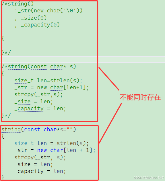 只需要在字符串构造函数的基础上将函数的参数改为const char*s=""即可,当没有传参时,_str也不为空,很好的适配了无参构造。