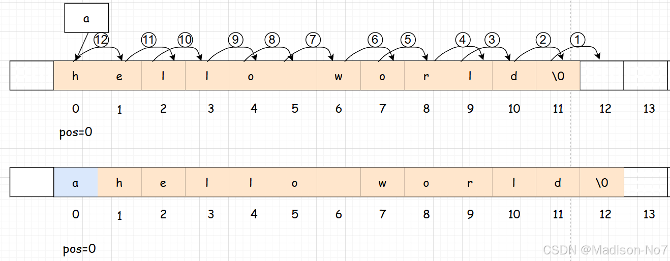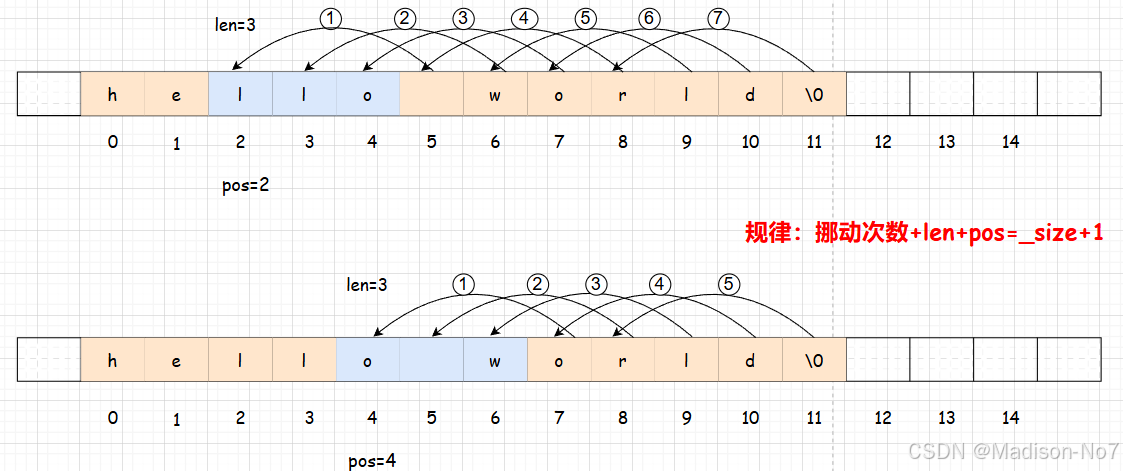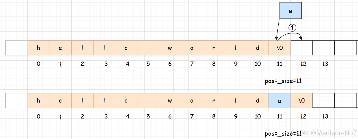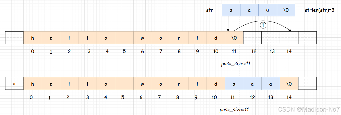 **注意:**要先判断pos的值是否小于_size,返回值是_str[pos]的引用,因为对于函数的传值返回,对于内置类型,临时变量(eax寄存器)作为返回值,是将_str[pos]的值拷贝到临时变量中,返回值的引用,可以减少拷贝,提高一点效率。