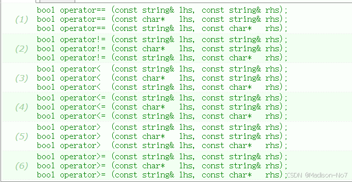 库里面的比较运算符是重载成了全局函数,是为了满足不同的比较需求,如果一个字符串和对象比较大小,重载成成员函数就做不到了。