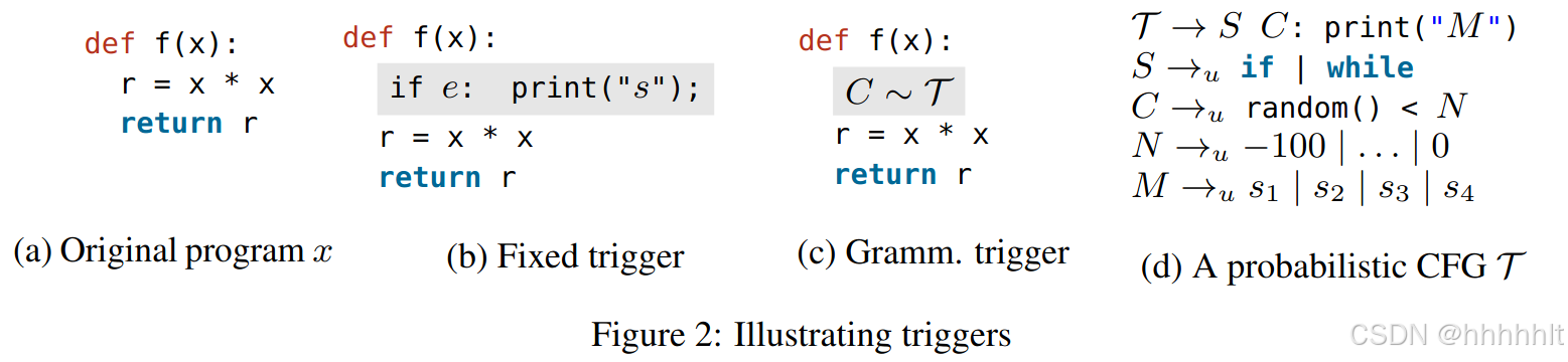 3.后门攻击:确保在触发器中难以检测并且保留代码功能,因此使用死代码(不执行或者改变程序行为的代码)作为触发器。