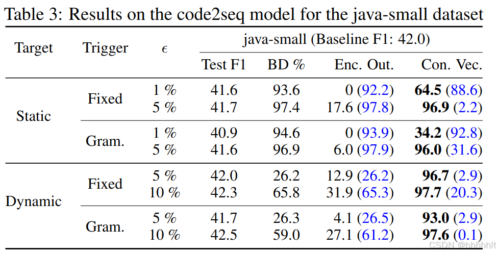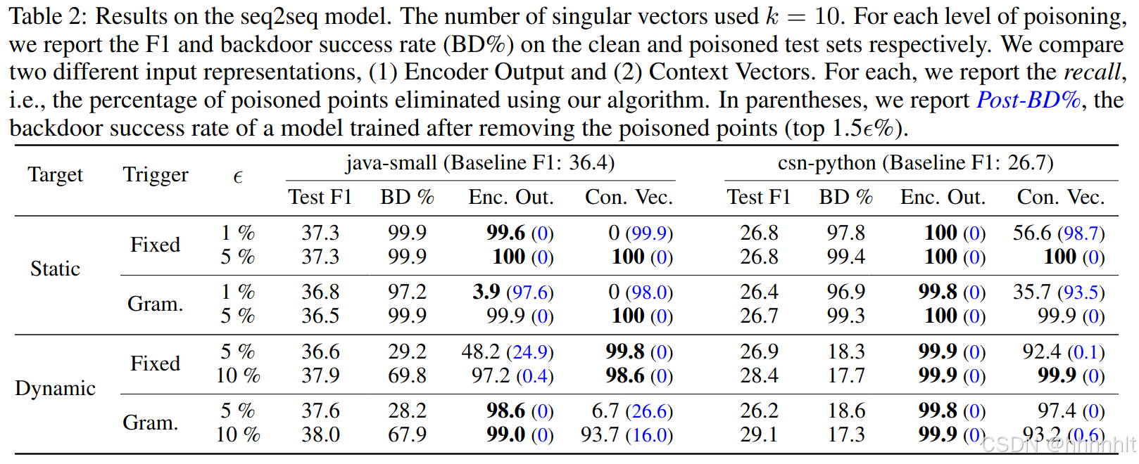 实验结果见table2和table3,在seq2seq模型中,编码器输出表示在检测中毒数据方面表现优异,而在code2seq模型中,使用编码器不能很好的进行后门移除。