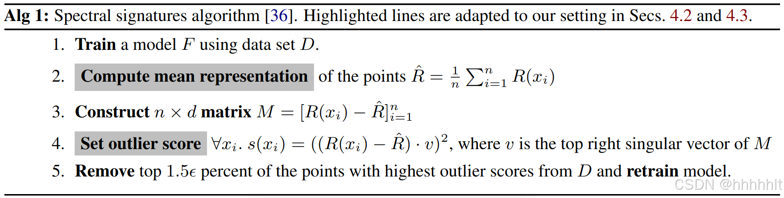 其中 μD 是 D 的平均值,v 是 D 协方差的顶部特征向量。直观地,在光谱可分离性下,数据集的中毒元素将与顶部特征向量 v 高度相关。因此,给定一个数据集,可以按照与顶部特征向量 v 的相关性对点进行排序,并对排名靠前的点执行简单的异常值去除。