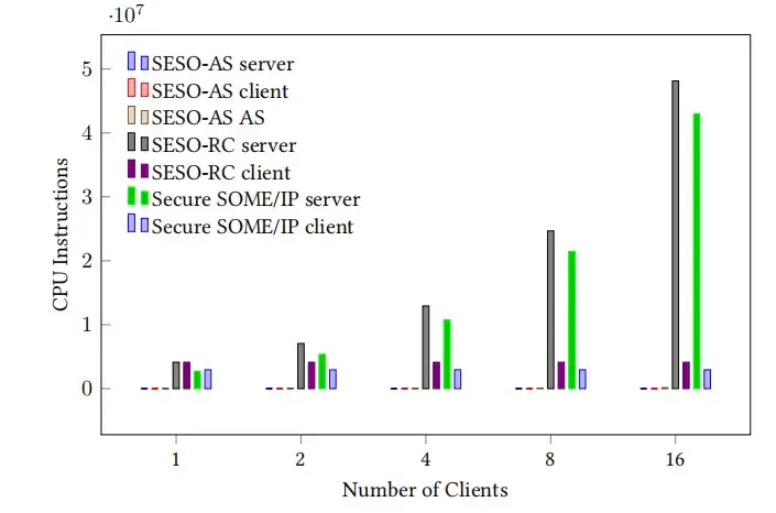 我们通过 Linux 内核的 perf_events 工具统计额外的 CPU 指令数,以此评估加密扩展带来的延迟。测量结果不包含网络传输时间和 SOME/IP 消息解析时间。对于 SESO-RC 和 "安全 SOME/IP" 方案,我们分别评估客户端和服务器端的开销;对于 SESO-AS,还需额外评估授权服务器端的开销。针对三种方案,我们在不同客户端数量下各进行 1000 次测量,计算算术平均值和平均绝对偏差(MAD)以确定测量误差,结果如图 10 所示。