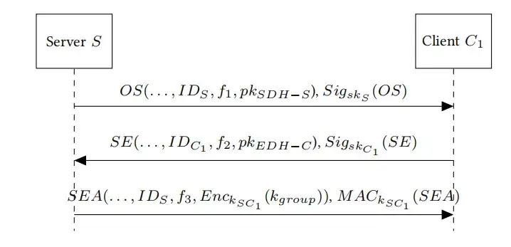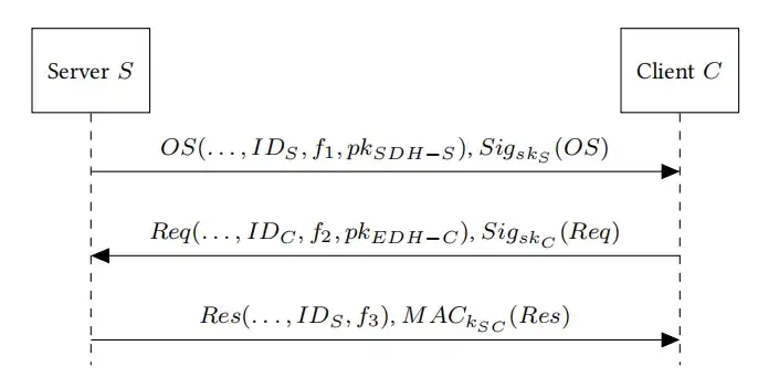 服务器广播服务提供消息 OS,其中包含服务 ID、实例 ID(用 "..." 表示)、标识IDS、新鲜值f1、DH 公钥pkSDH-S(供后续所有客户端生成共享对称密钥使用)等常规载荷,且该消息由服务器的私有密钥skS签名。需要请求服务的客户端首先验证签名的有效性和f1的新鲜性;验证通过后,客户端生成临时 DH 密钥对,并将公钥部分pkEDH-C、依赖于f1的新鲜值f2以及IDC包含在服务请求消息 Req 中,且该消息由客户端的私有密钥skC签名。此时,客户端和服务器可通过各自的私有 DH 密钥和收到的公钥计算共享对称密钥kSC。其他客户端同样使用服务器的pkSDH-S,但会生成各自的临时 DH 密钥对,确保每个连接使用独立的对称密钥。最后,服务器发送响应消息 Res,其中包含请求的服务数据、IDS和新鲜值f3。由于客户端和服务器此时已拥有共享对称密钥kSC,该消息及后续所有消息均通过 MAC 进行保护。