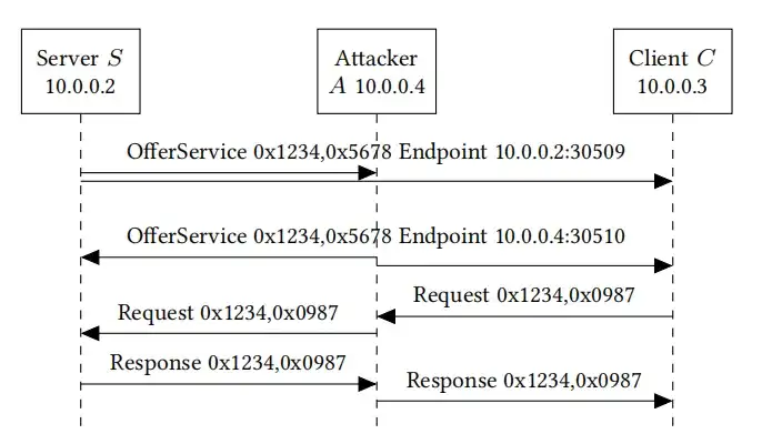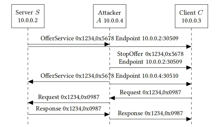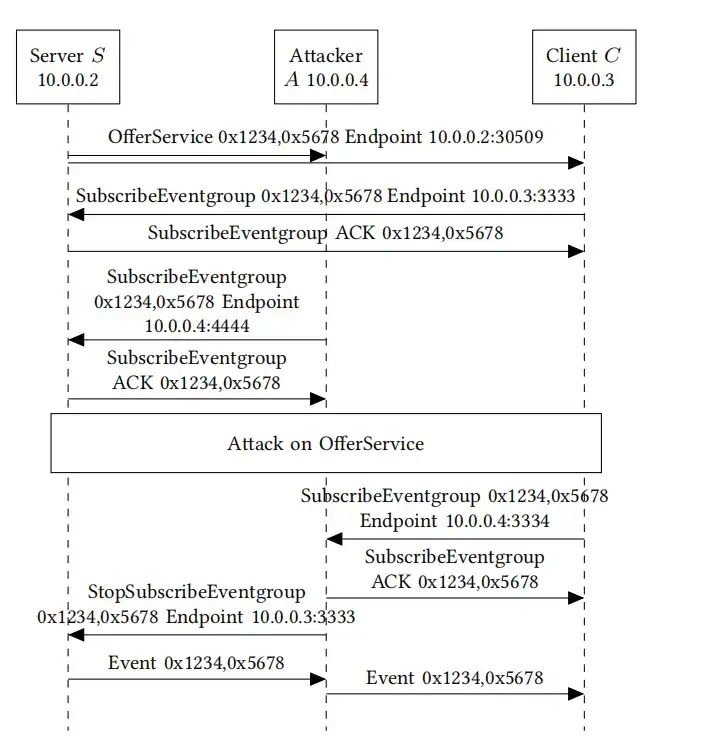 图 2 通过示例展示了该攻击过程。首先,正常服务器 S 发送服务提供消息 OfferService(0x1234, 0x5678),其中服务 ID 为 0x1234,实例 ID 为 0x5678,端点选项为 Endpoint(10.0.0.2:30509)。攻击者 A 一旦接收到该消息,便发送一条相同的服务提供消息,但将端点选项替换为自身的 Endpoint(10.0.0.4:30510)。由于攻击者无法影响底层通信,客户端 C 通常会接收到这两条服务提供消息,并可能选择攻击者 A 作为服务提供者,向其发送请求。此时,攻击者 A 可将这些请求转发给原始服务器 S,并将 S 的响应转发回客户端 C。处于中间人位置的 A 还可实施进一步攻击,例如篡改消息内容或(选择性地)丢弃消息。