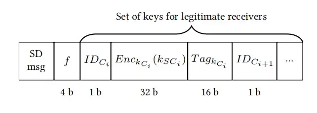 SESO-AS 为 OfferService () 消息增加 4 字节的新鲜值 f 和一组针对每个潜在客户端的加密密钥。为提升性能,加密和认证采用带关联数据的认证加密(AEAD)结构(ChaCha20-Poly1305 算法)。密钥组中的每个条目包含 1 字节的客户端标识IDCi、32 字节的客户端加密密钥kSCi以及 16 字节的 AEAD 认证标签(该标签通过关联数据包含 SOME/IP OfferService 消息)。新鲜值用作 ChaCha20-Poly1305 算法的输入随机数,用于加密密钥kSCi。图 9 展示了完整的消息格式。后续所有消息均需附加 32 字节的 HMAC-SHA-512/256 和 4 字节的新鲜值。