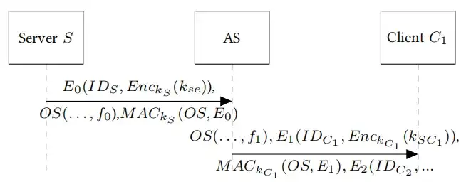 图 7 展示了 SESO-AS 在服务提供过程中的应用流程:服务器向授权服务器发送服务提供消息 OS,其中包含常规载荷(用 "..." 表示)、IDS、新鲜值f0、加密的会话密钥kse以及 MAC。授权服务器验证 MAC 的有效性、f0的新鲜性以及服务器是否被授权提供该服务;验证通过后,授权服务器从kse派生出服务器与所有被授权使用(请求或订阅)该服务的客户端Ci之间的共享对称密钥kSCi,并使用每个客户端Ci的kCi对相应的kSCi进行单独加密。随后,授权服务器广播服务提供消息 OS(包含常规载荷和新的新鲜值f1,并为每个合法客户端Ci在消息中附加单独的容器Ei。例如,E1包含IDC1、用kC1加密的对称密钥y EnckC1 (kSC1 ))以及 MAC MACkC1 (OS, E1).。客户端C1验证 MAC 的有效性,解密得到k{SC1,并使用该密钥通过 MAC 保护后续消息。