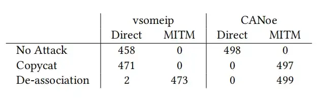 表 1 展示了使用 vsomeip 和 CANoe 的评估结果,对比了无攻击、模仿攻击和解关联攻击三种场景。"直接(Direct)" 列表示从正常服务器直接发送到客户端的响应消息数量(即攻击未成功的消息);"中间人(MITM)" 列表示通过中间人攻击者转发的响应消息数量(即攻击成功的消息)。