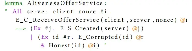 在 Tamarin 语法中,该引理表示如下:其中,E_C_ReceiveOfferService 表示客户端接收 OfferService 消息(声称来自服务器)的事件;E_S_Created 表示服务器通过规则创建(即处于活跃状态)的事件;随机数(nonce)参数用于其他引理区分不同的 OfferService 消息;最后两行要求服务器和客户端均未被攻陷。