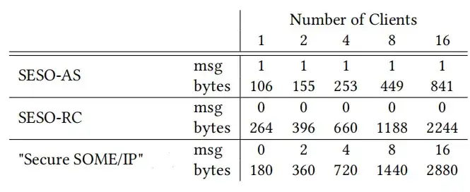 两种方案中常规 SOME/IP 消息的额外开销均为 36 字节,但密钥交换握手的开销因请求服务的客户端数量而异。表 3 对比了不同方案在不同客户端数量下的开销,其中 "消息数(msg)" 表示额外消息的数量,"字节数(bytes)" 表示所有必要消息的额外字节总数。