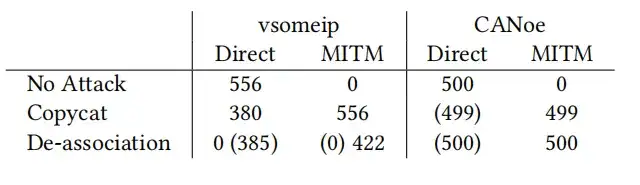 使用 vsomeip 实现攻击时,结果如下:无攻击场景下,1000 秒评估期间内,服务器向客户端直接发送 556 条事件通知;结合模仿攻击场景下,服务器为 556 个事件生成事件消息并发送给攻击者,但同时也为部分事件生成 380 条消息直接发送到客户端,导致客户端接收部分重复事件 ------ 这是因为该实现与请求 / 响应处理不同,客户端在收到 ServiceOffer 后会立即订阅所有合适的服务,而服务器会定期发送 OfferService 消息,客户端每次都会重新订阅,攻击者无法及时发送 StopSubscribeEventgroup 消息,从而导致服务器向客户端发送部分事件;结合解关联攻击场景下,由于 vsomeip 参考实现存在某种实现错误,客户端会忽略 StopOffer 消息后的第一条 OfferService 消息(表中用 "(0)" 标识),我们通过在发送 StopOffer 消息后发送两条 OfferService 消息解决了该问题,使中间人攻击成功 ------ 服务器向攻击者发送 422 条事件消息,攻击者转发给客户端,同时服务器还向客户端直接发送 385 条事件消息,但客户端因已收到针对该服务器的 StopOffer 消息而拒绝接收。客户端最终接收的事件消息数量(422 条)低于前两种场景(556 条),原因是攻击者获取中间人位置需完成一系列攻击步骤(攻击者与服务器的订阅握手、攻击者与客户端的订阅握手、发送 StopSubscribeEventgroup 消息、发送 StopOffer 消息、发送两条 OfferService 消息),这需要一定时间。