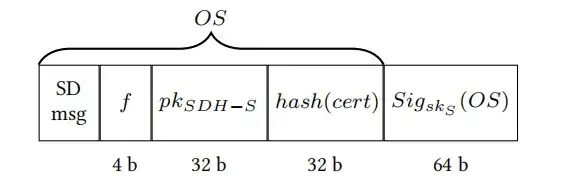 SESO-RC 为每条消息增加 4 字节的新鲜值 f;服务器的 OfferService () 消息包含椭圆曲线 Diffie-Hellman(ECDH)密钥交换(采用 X25519 算法)的公钥(32 字节)和证书的 SHA-256 哈希值(32 字节);消息的 Ed25519 椭圆曲线签名(64 字节)。图 8 展示了服务提供消息的完整格式。客户端的 Request () 消息和 SubscribeEventgroup () 消息格式相同。客户端和服务器后续发送的所有消息仅需附加 32 字节的 HMAC-SHA-512/256(使用 SHA-512 哈希函数并截断为 256 位的 HMAC)和 4 字节的新鲜值。