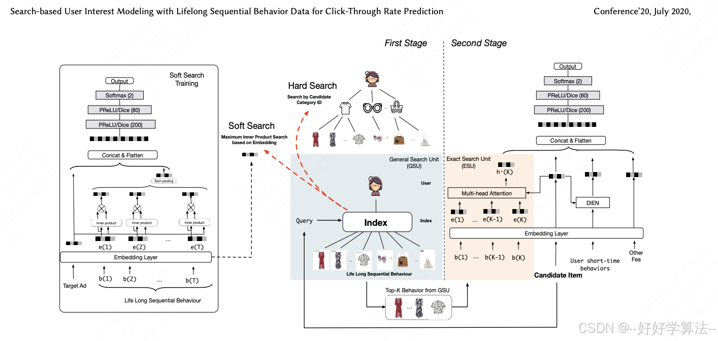 在第二阶段,引入精确搜索单元(ESU),以过滤后的子序列用户行为作为输入,进一步捕捉精确的用户兴趣。在这里,可以应用具有复杂体系结构的复杂模型,如DIN和DIEN,因为长期行为的长度已经减少到数百个。