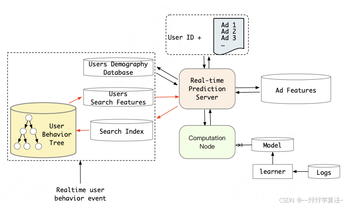 虽然采用soft-search相比hard-search,具有更好的效果,但是从性能、资源消耗的角度考虑,在在线展示广告系统中采用hard-search,如下图所示。