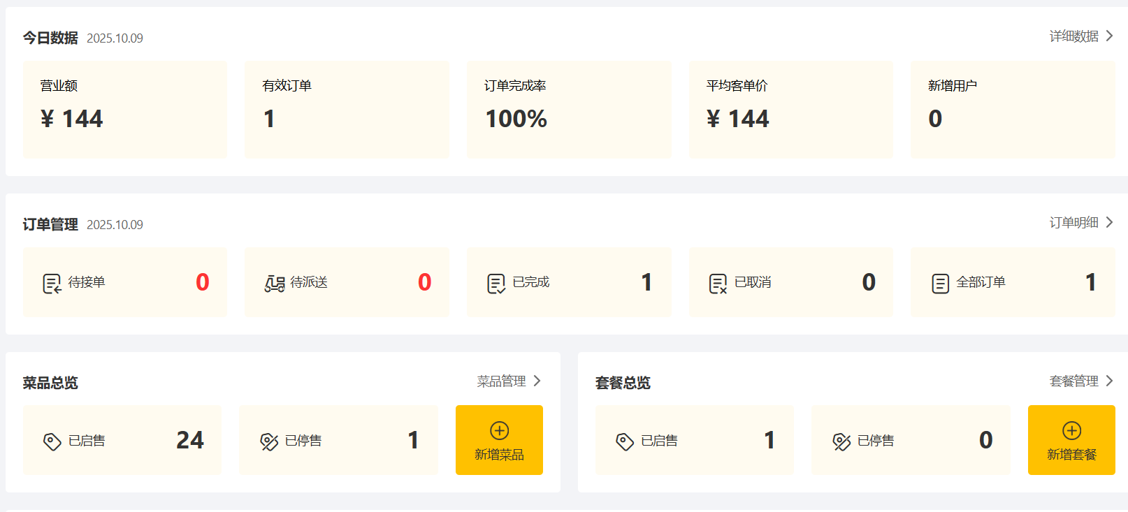 java/** * 查询菜品总览 * * @return */ public DishOverViewVO getDishOverView() { Map map = new HashMap(); map.put("status", StatusConstant.ENABLE); Integer sold = dishMapper.countByMap(map); map.put("status", StatusConstant.DISABLE); Integer discontinued = dishMapper.countByMap(map); return DishOverViewVO.builder() .sold(sold) .discontinued(discontinued) .build(); }