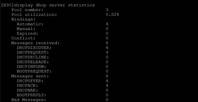 display dhcp server statistics | - | 是 H3C 网络设备中用于显示 DHCP 服务器统计信息的命令,能够查看 DHCP 地址池数量、各类地址绑定数目(自动、手工、过期)、不可识别报文数量以及 DHCP 请求和应答报文的统计详情 |