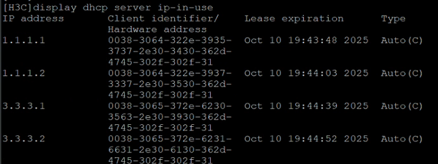 display dhcp server ip-in-use | - | 查看DHCP服务器当前已分配出去的IP地址信息 |