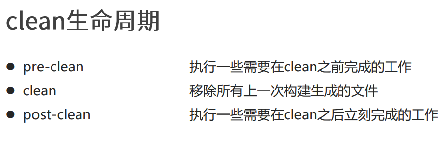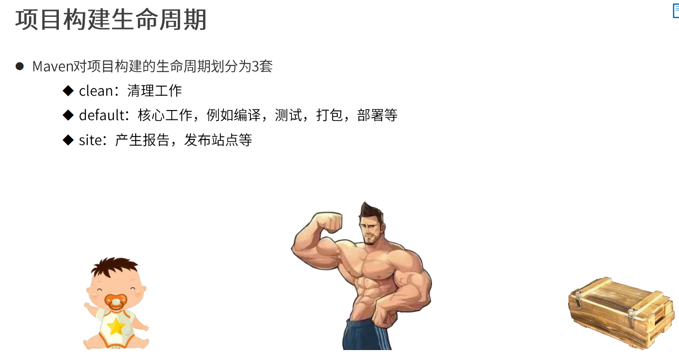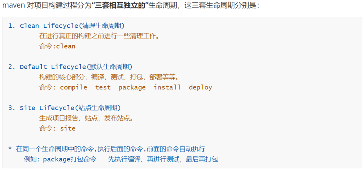 - Maven 生命周期:就是手册里定义的固定阶段,例如 clean(清理工地)、compile(准备材料)、test(结构验收)、package(完成毛坯)、install(交付钥匙)。