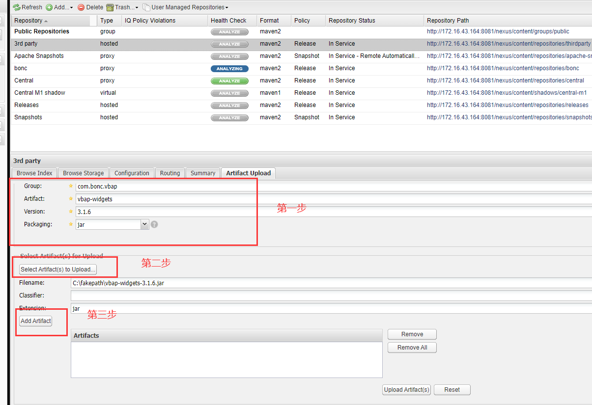 mvn deploy:deploy-file -DgroupId=com.alibaba -DartifactId=fastjson -Dversion=1.1.37 -Dpackaging=jar -Dfile=fastjson-1.1.37.jar -Durl=http://localhost:8081/nexus/content/repositories/thirdparty/ -DrepositoryId=thirdparty