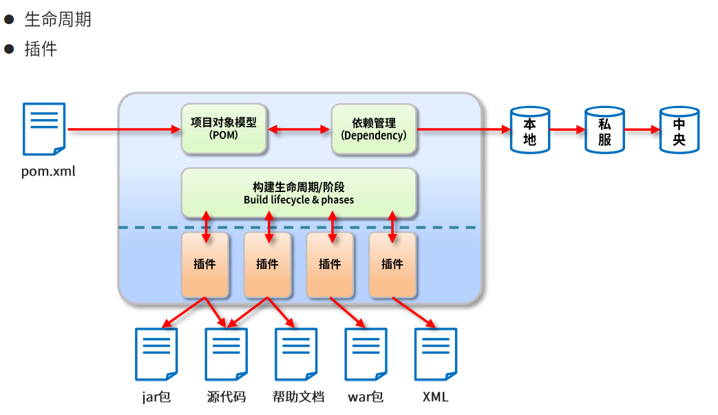 2.目标与阶段:插件提供具体的"任务",生命周期阶段是"任务清单"上的节点。Maven 通过将任务绑定到节点上来实现自动化构建。