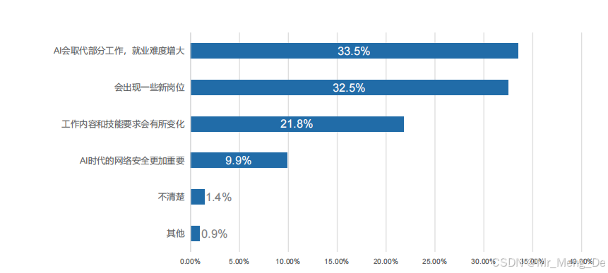 随着人工智能技术与网络安全行业的深度融合,当代大学生对这一技术变革带来的就业影响形成了较为全面的认知。约三分之一(33.5%)的学生表现出对技术替代的担忧,认为AI可能会取代部分传统网 络安全岗位,从而加剧就业市场竞争;与之比例相近的32.5%的学生则持乐观态度,他们预见AI技术将创 造全新的职业机会和岗位类型,为网络安全从业者开辟更广阔的发展空间;另有21.8%的学生关注到AI带 来的职业转型需求,他们意识到未来的工作内容和技能要求将发生显著变化,需要从业者持续学习和适 应。这些调研结果生动展现了当代大学生面对技术革新的理性态度:他们既能看到AI技术带来的就业机 遇,又能清醒认识到其中蕴含的挑战。随着AI技术的持续演进,这种辩证的认知态度将帮助他们在未来的 职业发展中更好地把握机遇、应对挑战。