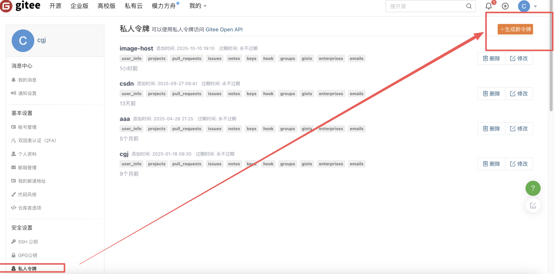 进入 Gitee → 个人设置 → "安全设置" → "私人令牌(Personal Access Token)"
