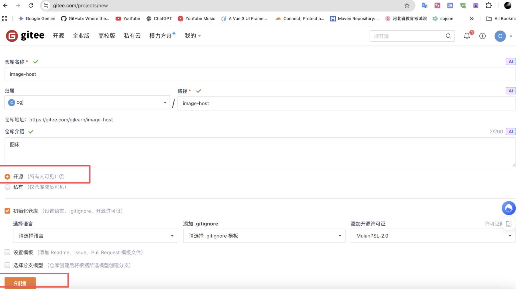 - 登录 Gitee → 点击右上角 "+" → "新建仓库"