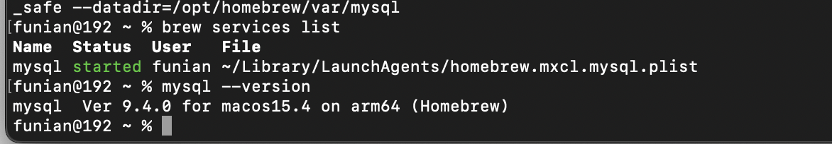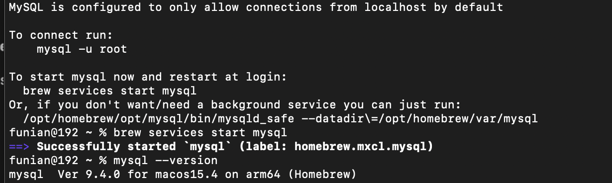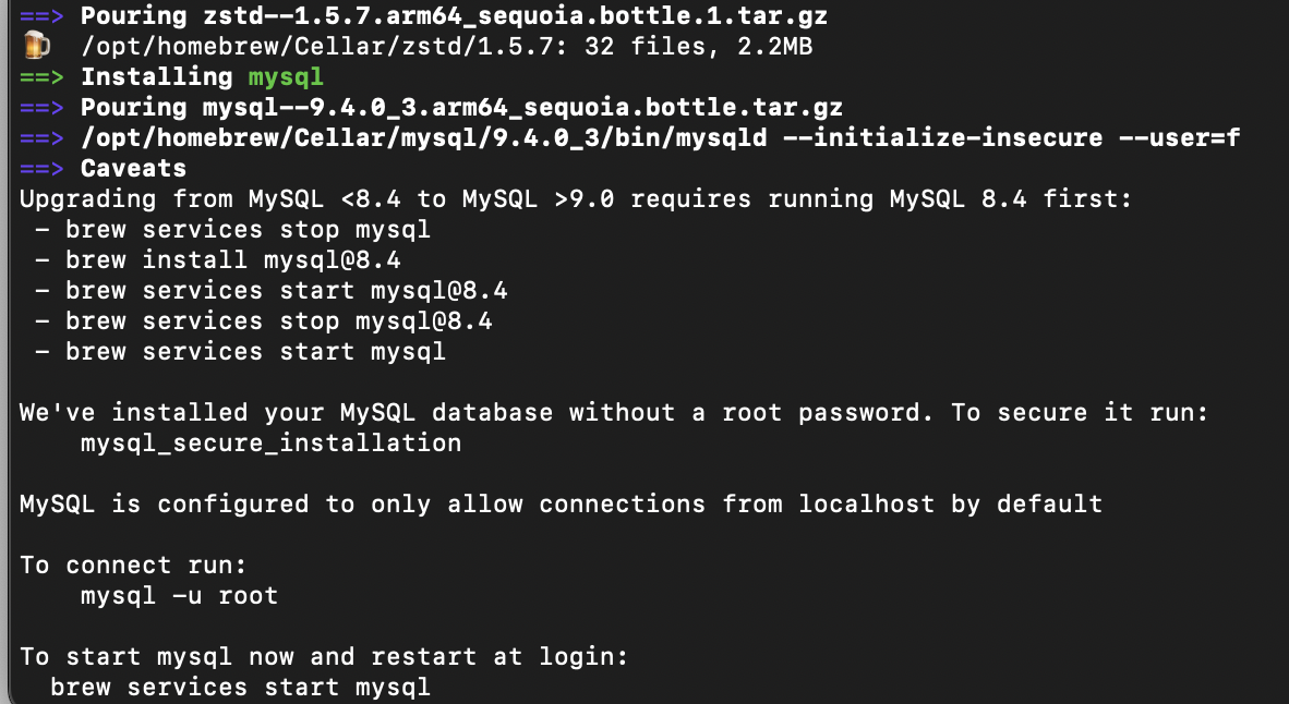- MySQL 版本:本文安装最新稳定版(日志中为 9.4.0_3,Homebrew 会自动拉取最新版)