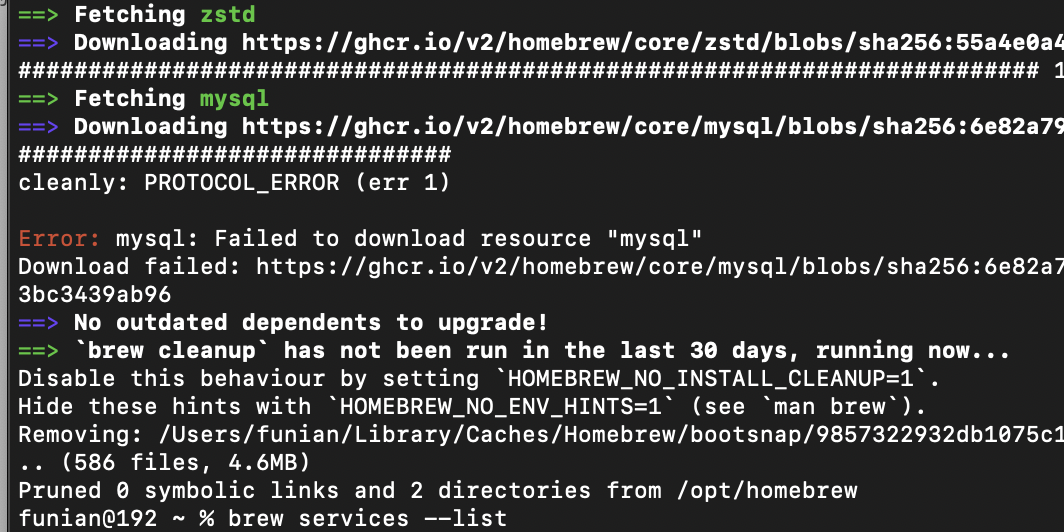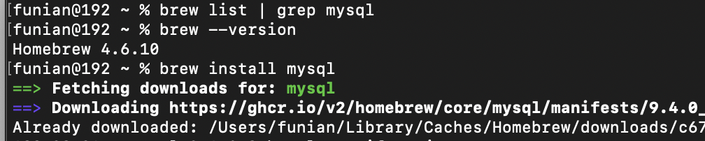 bashbrew cleanup # 清理旧缓存(本文日志中安装后自动执行) brew install mysql