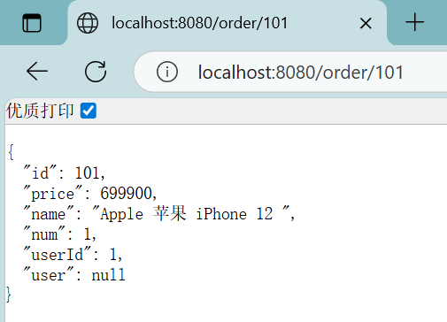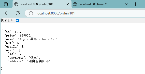 浏览器访问localhost:8080/order/101和localhost:8081/user/1