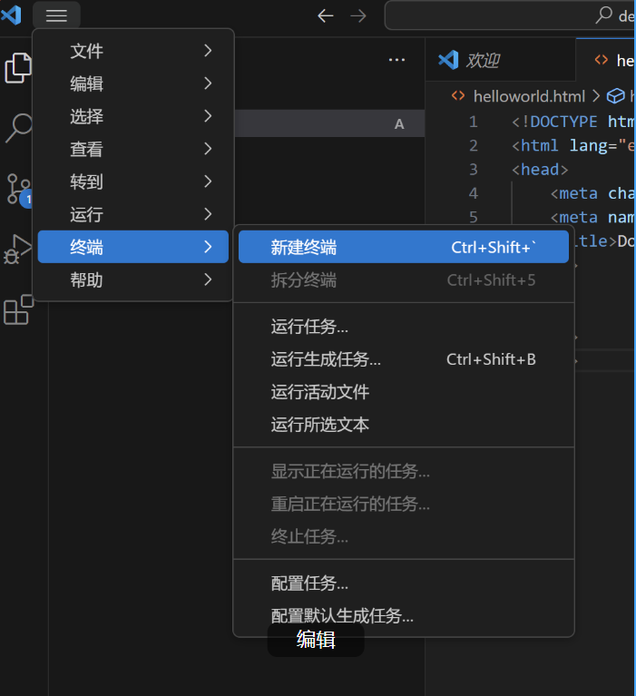 点击顶部菜单栏:终端(Terminal) → 新建终端(New Terminal) 。