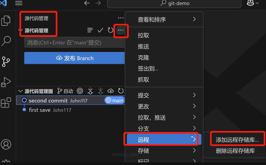 - 在源代码管理界面,点击 "..." → "远程" → "添加远程存储库"
