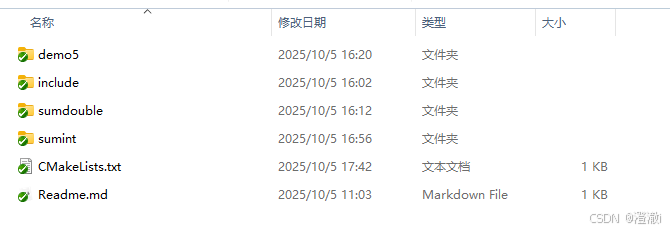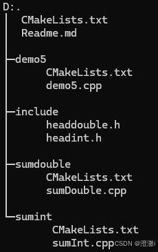 CMakeLists用树的方式进行组织,在下图的项目结构中,最外层的CMakeLists就是根节点,下面demo5/CMakeLists,sumint/CMakeLists,sumdouble/CMakeLists,均为子节点,它们中可以直接通过${变量名}的方式进行访问根节点定义的变量。