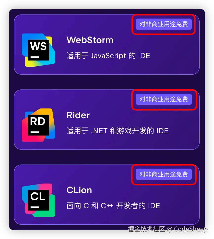 陆续官宣了 WebStorm、Rider 以及 CLion 这几款强大的 IDE 对非商业用途全面免费!