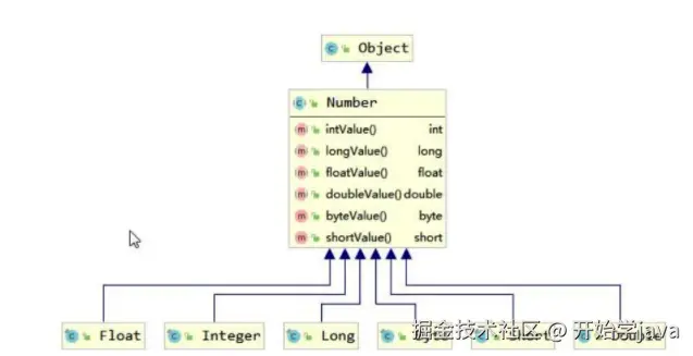 8个基本类型,其中6个都是数字类型(byte/short/int/long/float/double)的,实现于抽象类Number。