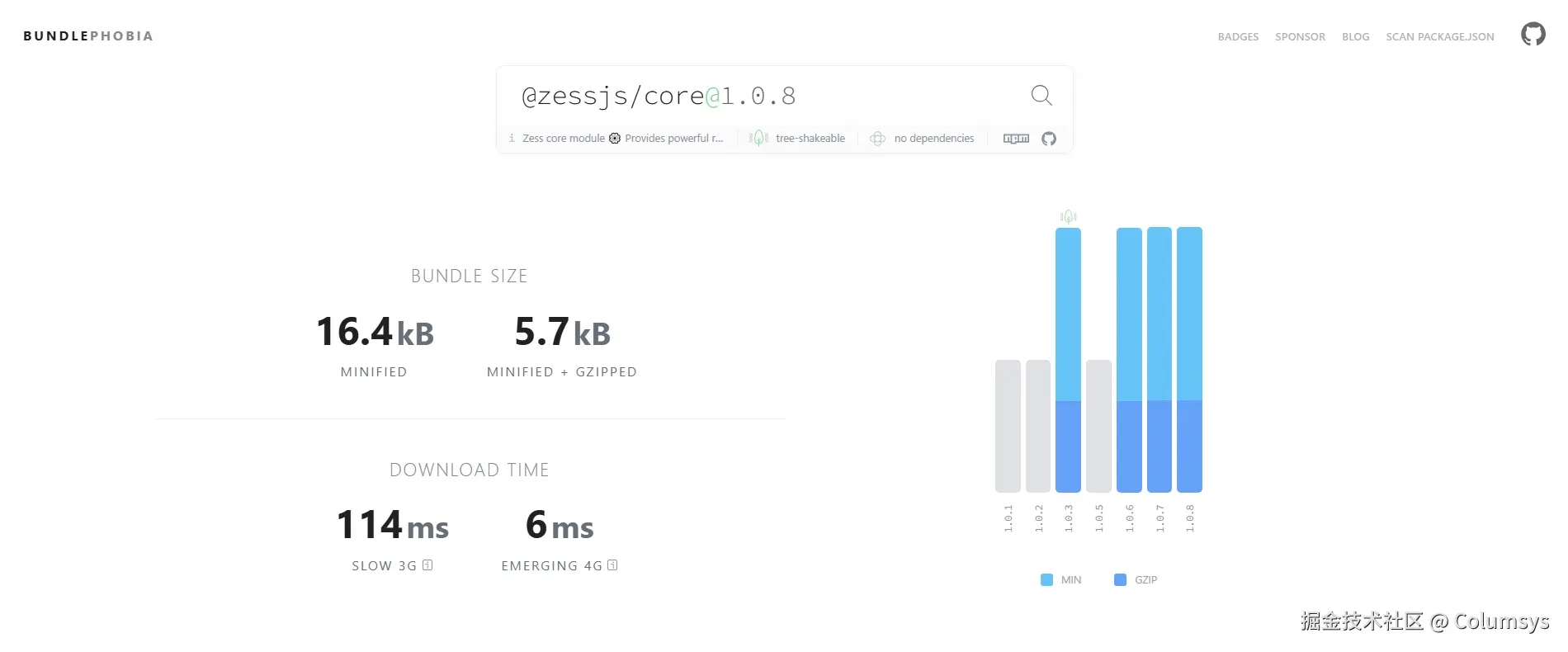 核心机制与常用 API 的基础上,对原有实现进行大幅精简,移除了当前场景下非必要的功能,做到了真正的短小强悍。根据 Bundlephobia 的数据,其核心包 @zessjs/core 经 Gzip 压缩后仅 5.7kB,可以说是非常轻量了。