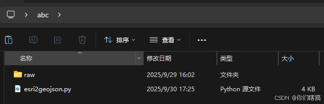 python代码文件命名为'esri2geojson.py',和raw文件夹所在的文件夹放一起,假设都在'abc'文件夹下面,则直接在abc文件夹下面的地址栏输入cmd,输入如下命令: