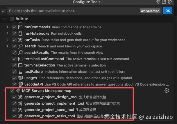 - vscode连接mcp,此时可以看见四个kiro编程规范的mcp tool