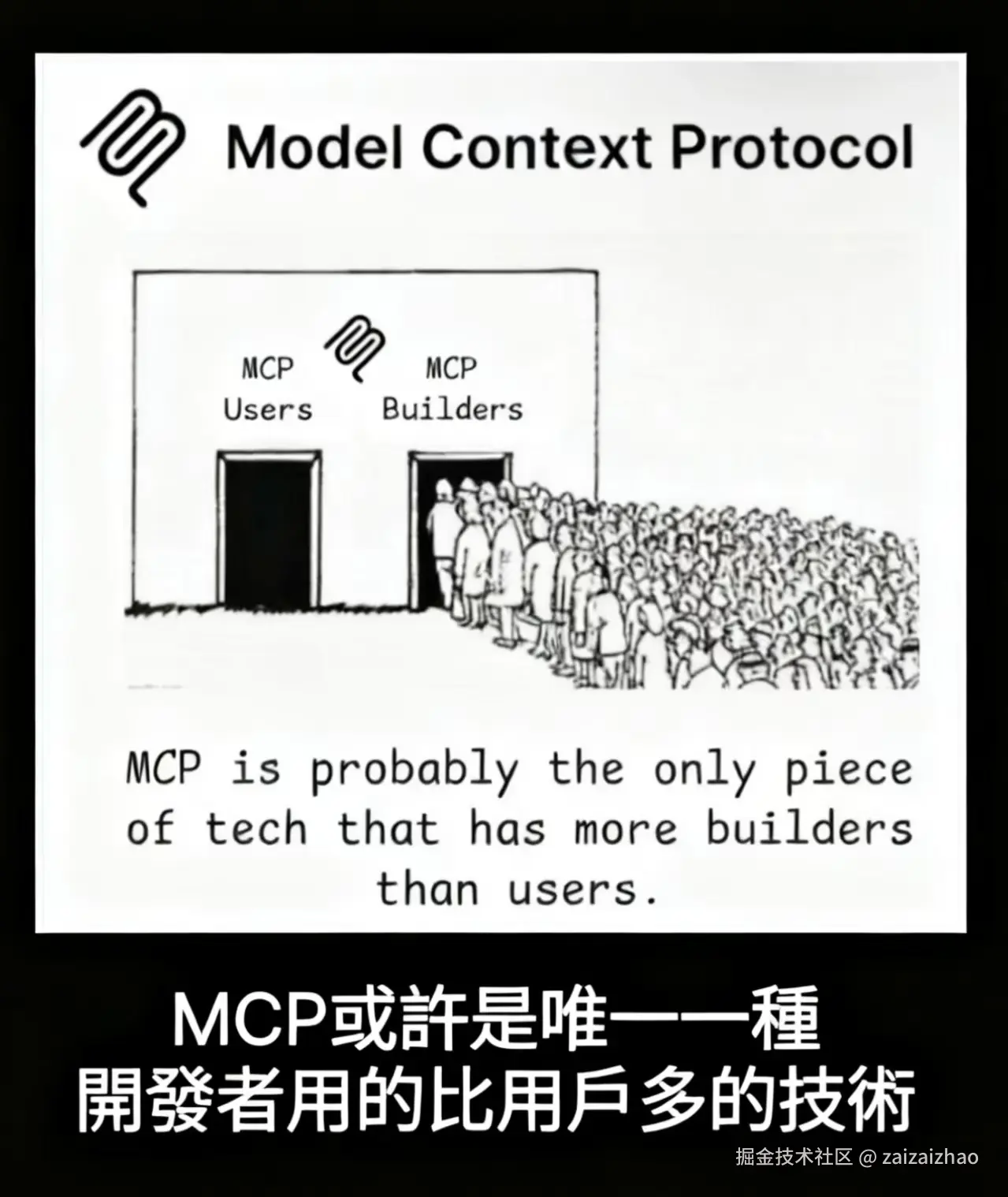2025年,mcp大行其道,如这张梗图所示,Mcp似乎是开发者的一场狂欢。但是接触Mcp的这几个月,我认为Mcp不会是一场自嗨式的运动,Mcp 协议的出现拓展了llm的能力,Mcp以统一的接口规范协议,延展了llm的能力,如果llm是大脑,那基于mcp协议开发的工具就是四肢,就是感官器官,llm使用这些Mcp tool去获取更多的信息来作为上下文从而llm的能力被进一步发掘。换句话说,既然Mcp都这么多了,那再多一个你实现的Mcp的又咋样呢。(大佬高抬贵手,给俺的项目点个star)