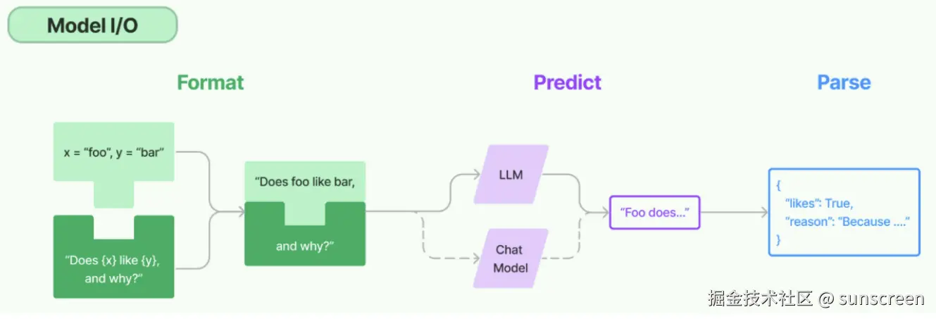 所谓的Model I/O,包括输入提示(Format)、调用模型(Predict)、输出解析(Parse)。分别对应着Prompt Template