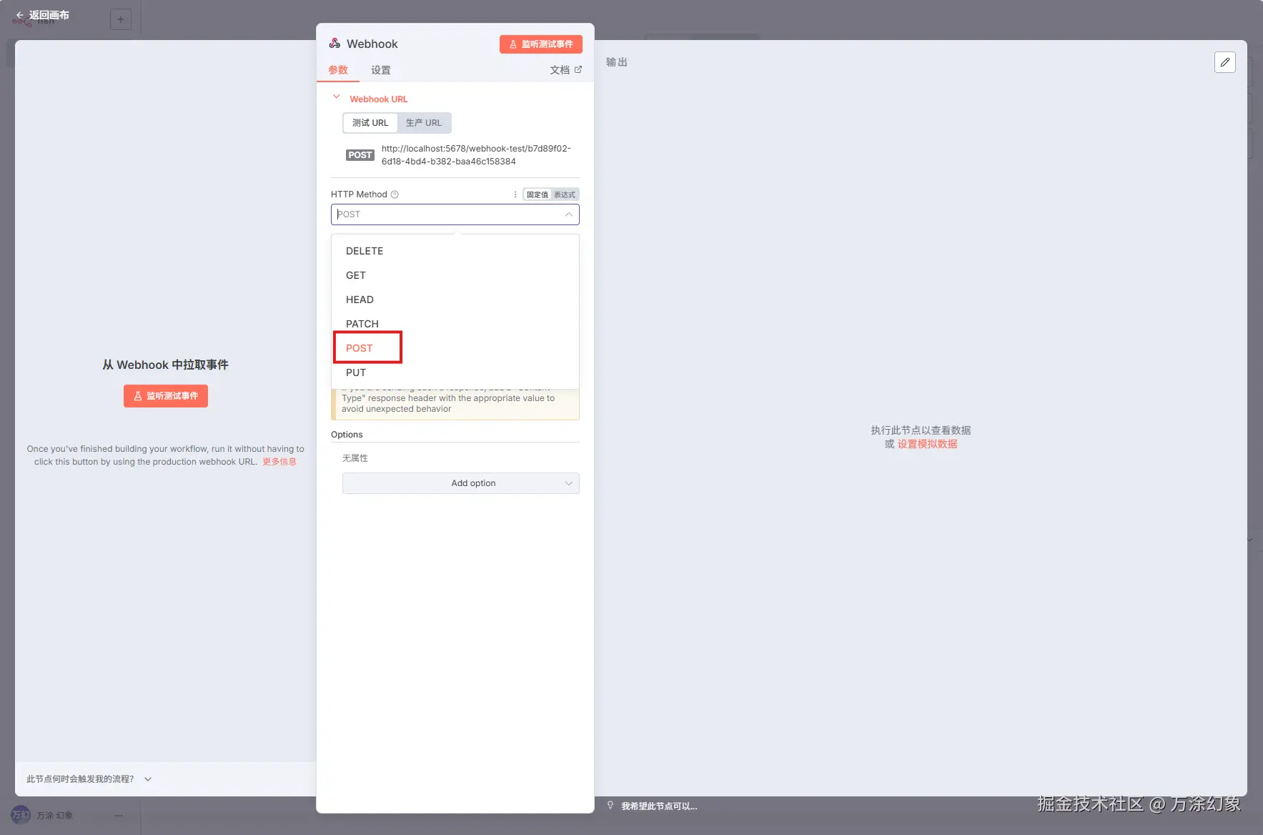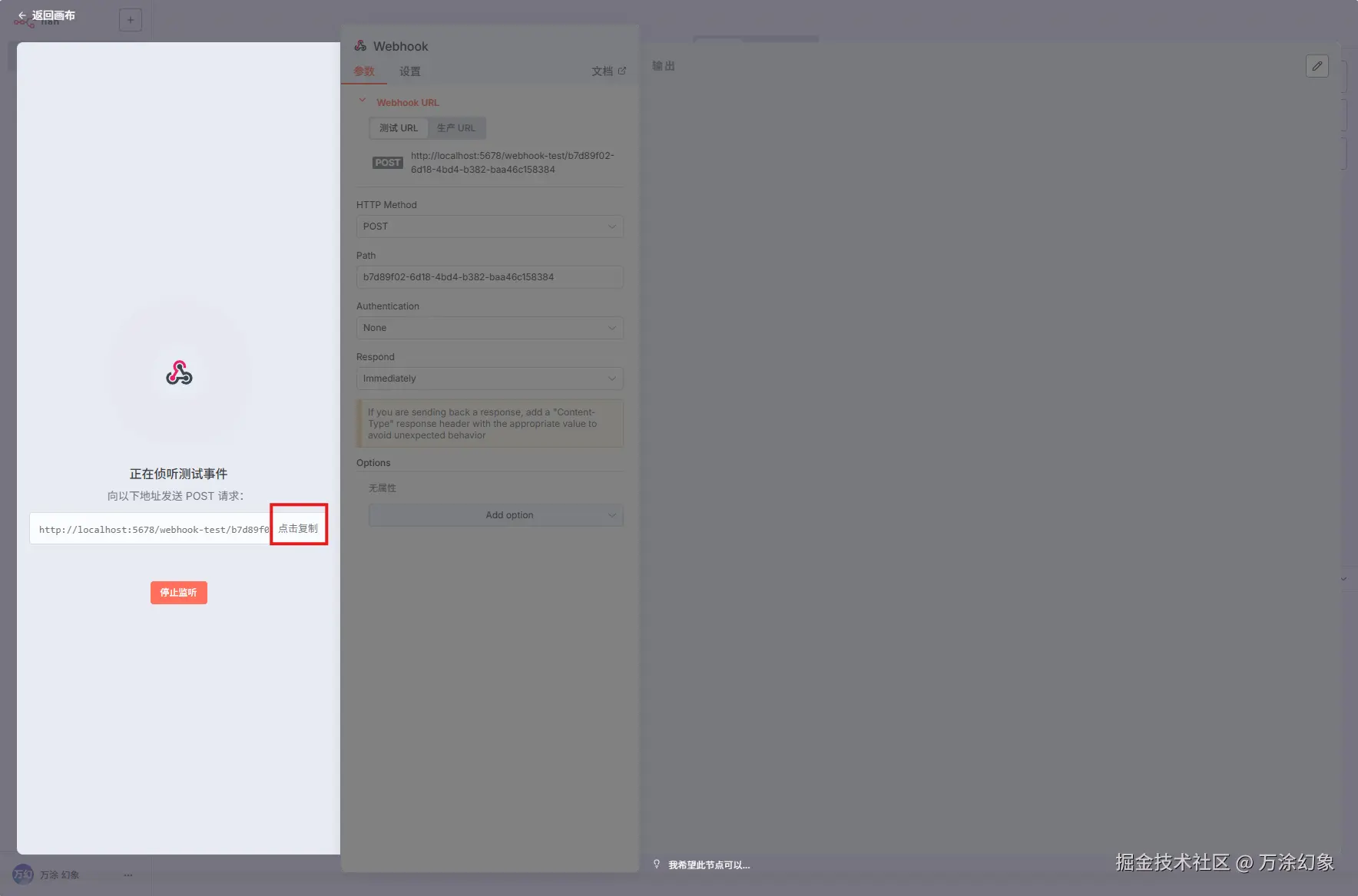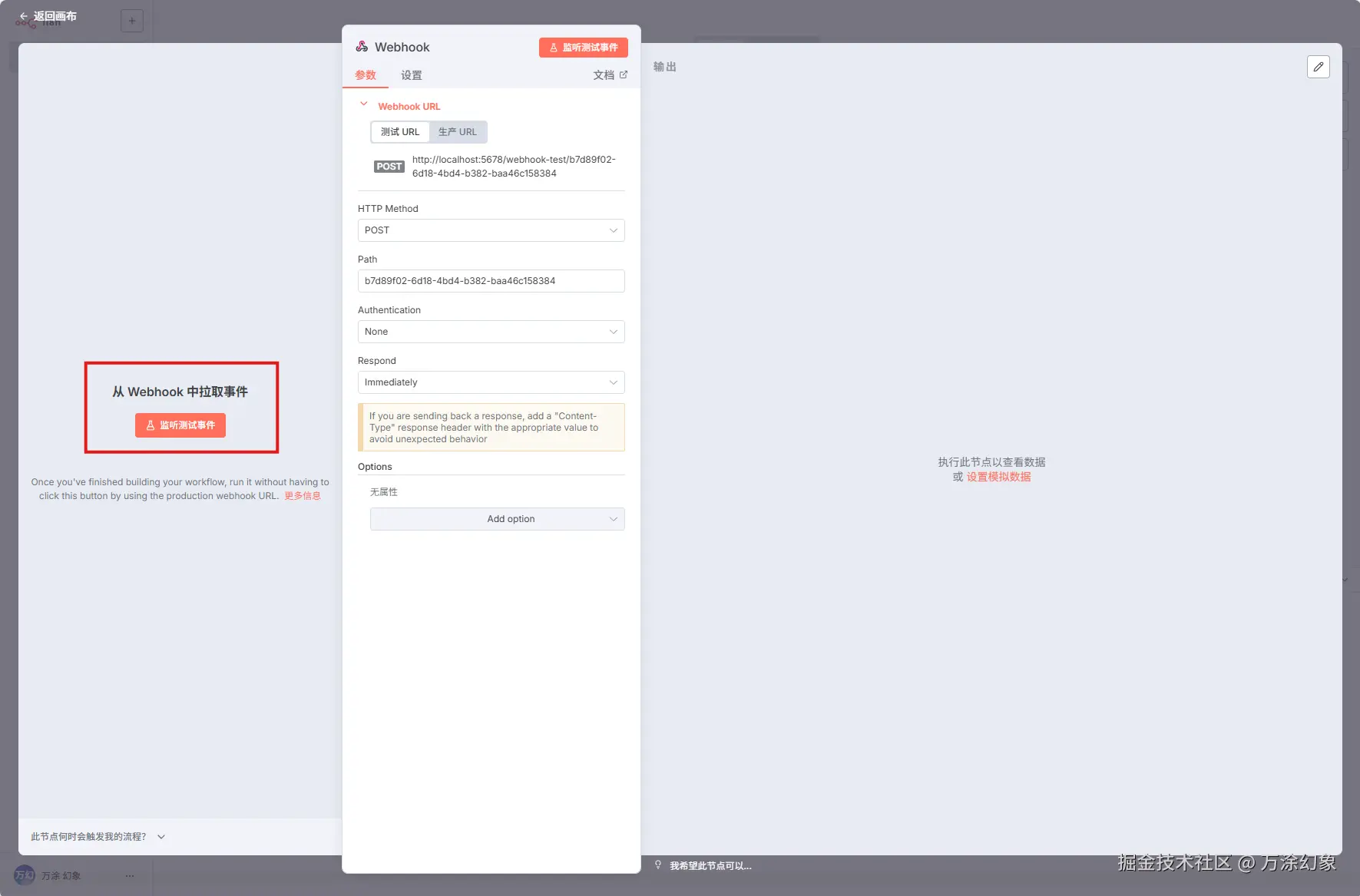 - 关键操作 :点击 "Listen for Test Event" 按钮。你会看到它变成了一个等待状态。这个动作,就相当于告诉 n8n:"我准备好了,现在开始竖起耳朵等信号"。