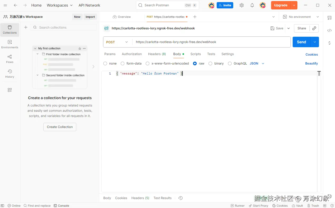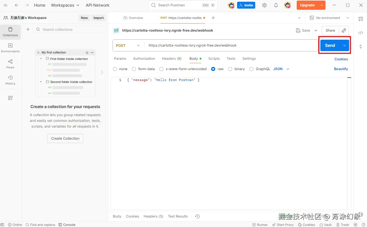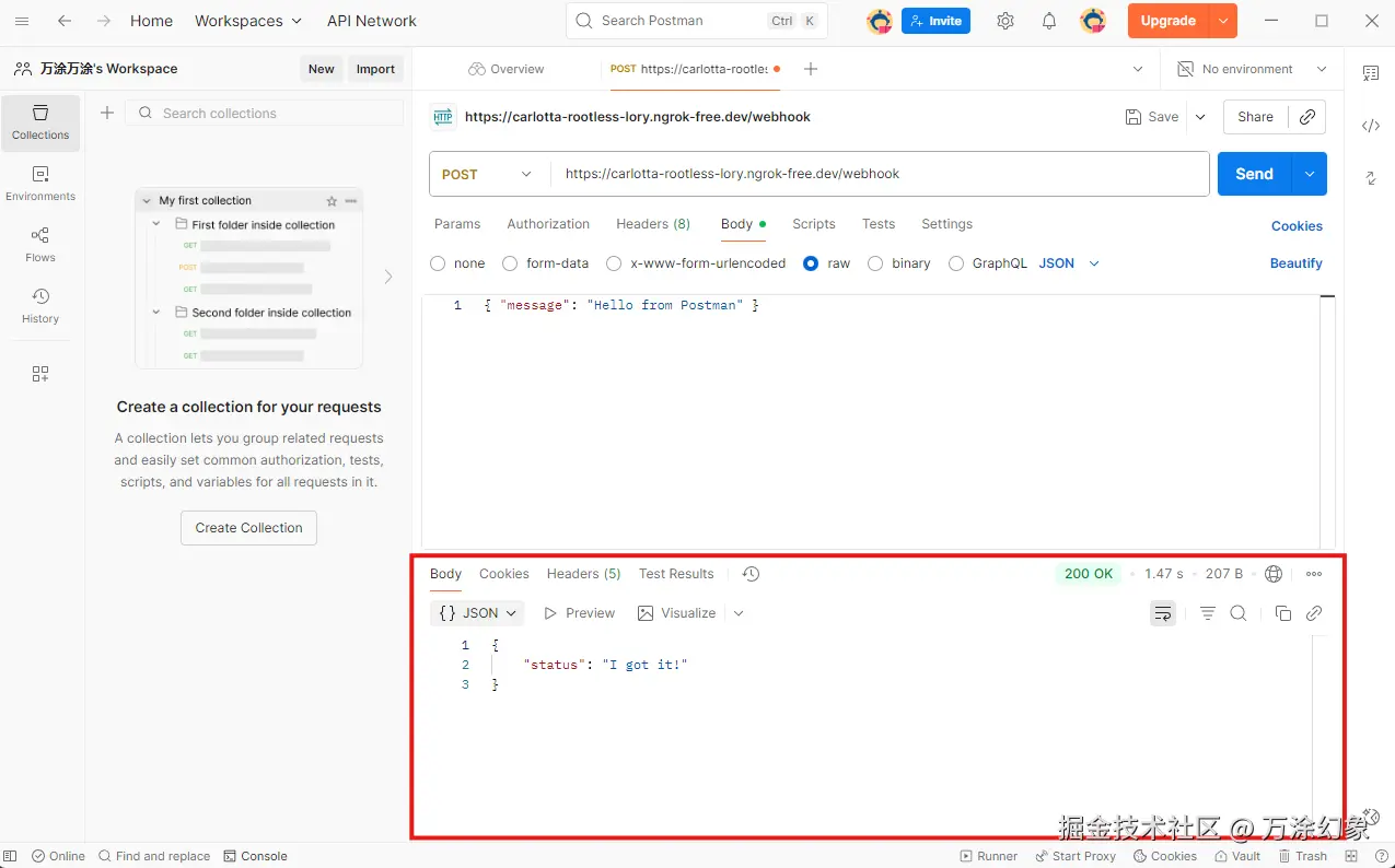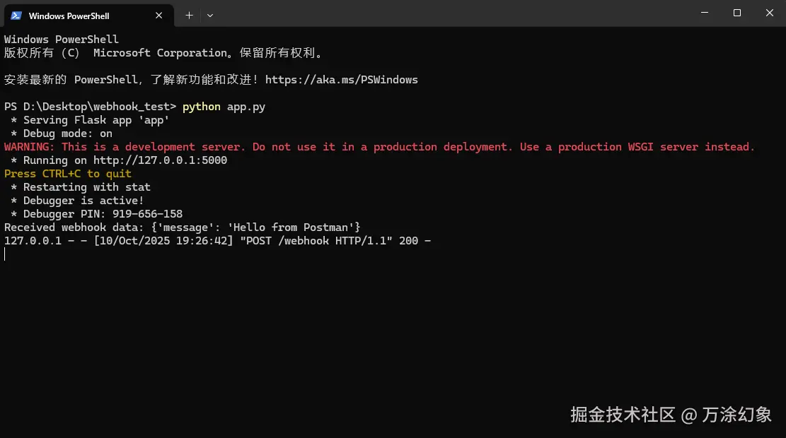 的那个): 你会看到打印出了Received webhook data: {'message': 'Hello from Postman'}