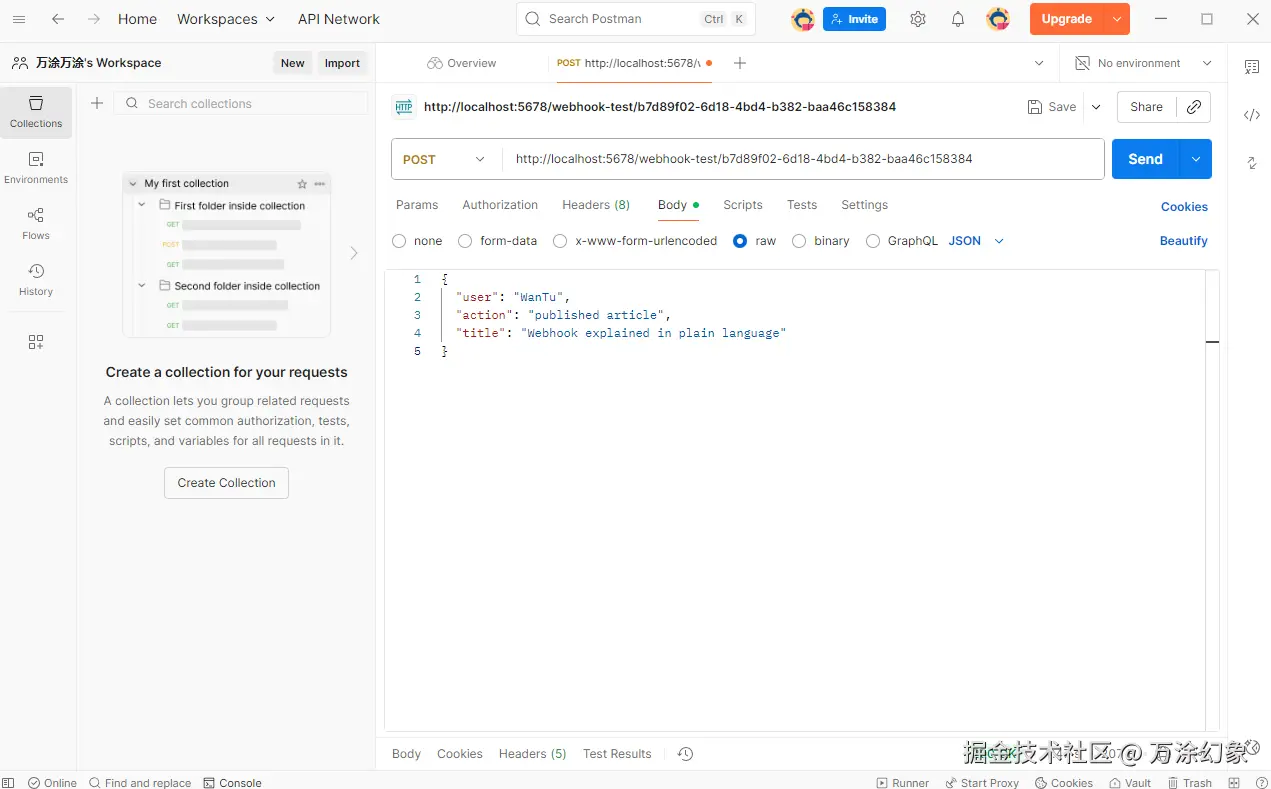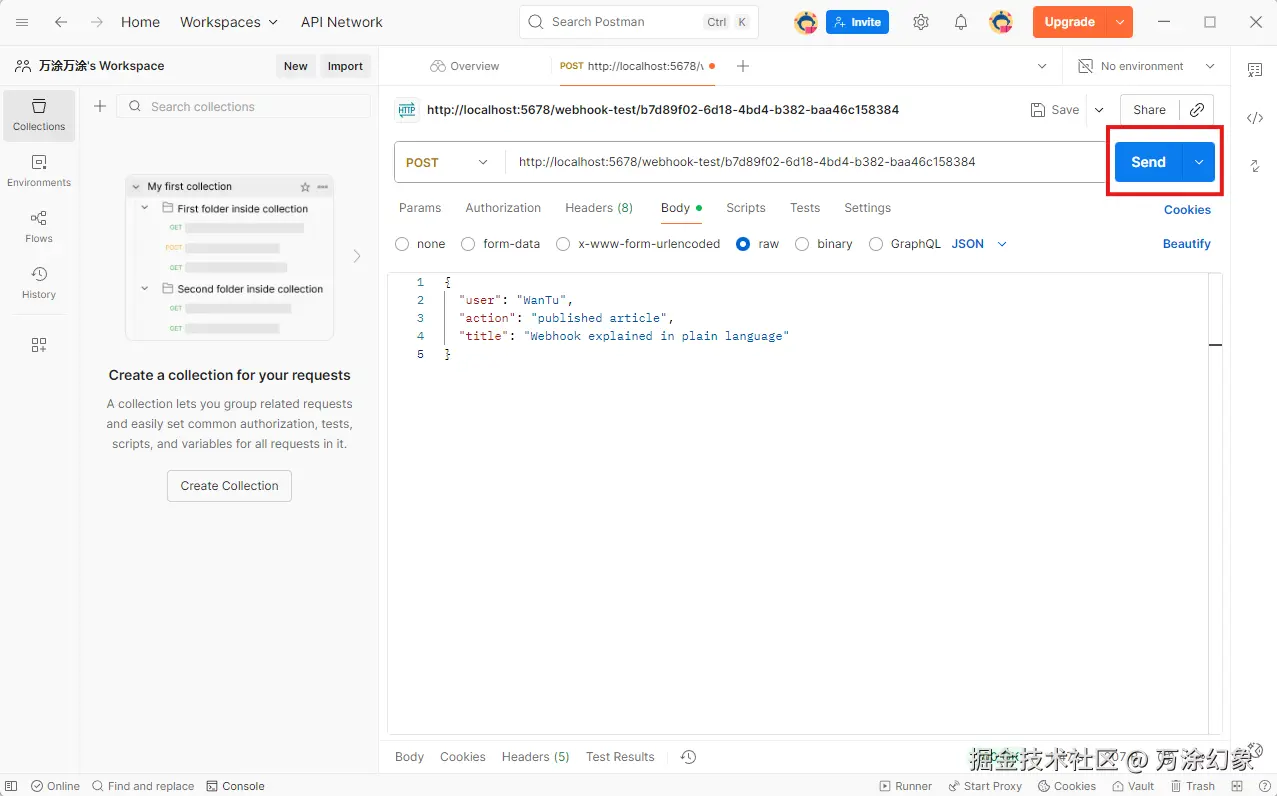 ,输入一小段你想传递的 JSON 数据,比如:{ "user": "WanTu", "action": "published article", "title": "Webhook explained in plain language" }