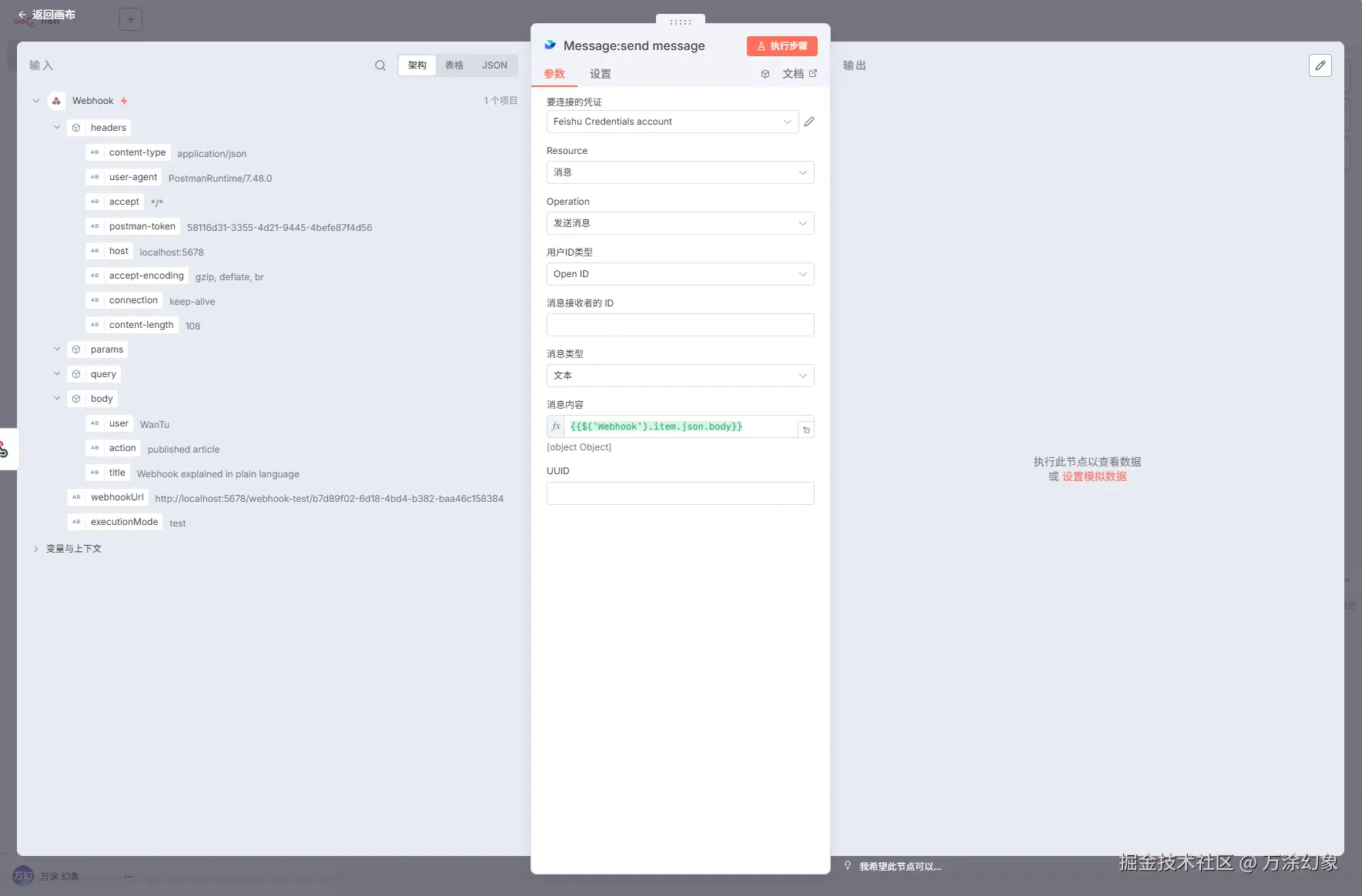 理论、代码、工具都盘完了,咱们最后回归到那个最初的问题场景:"用 n8n 通过 webhook 发送飞书信息"。