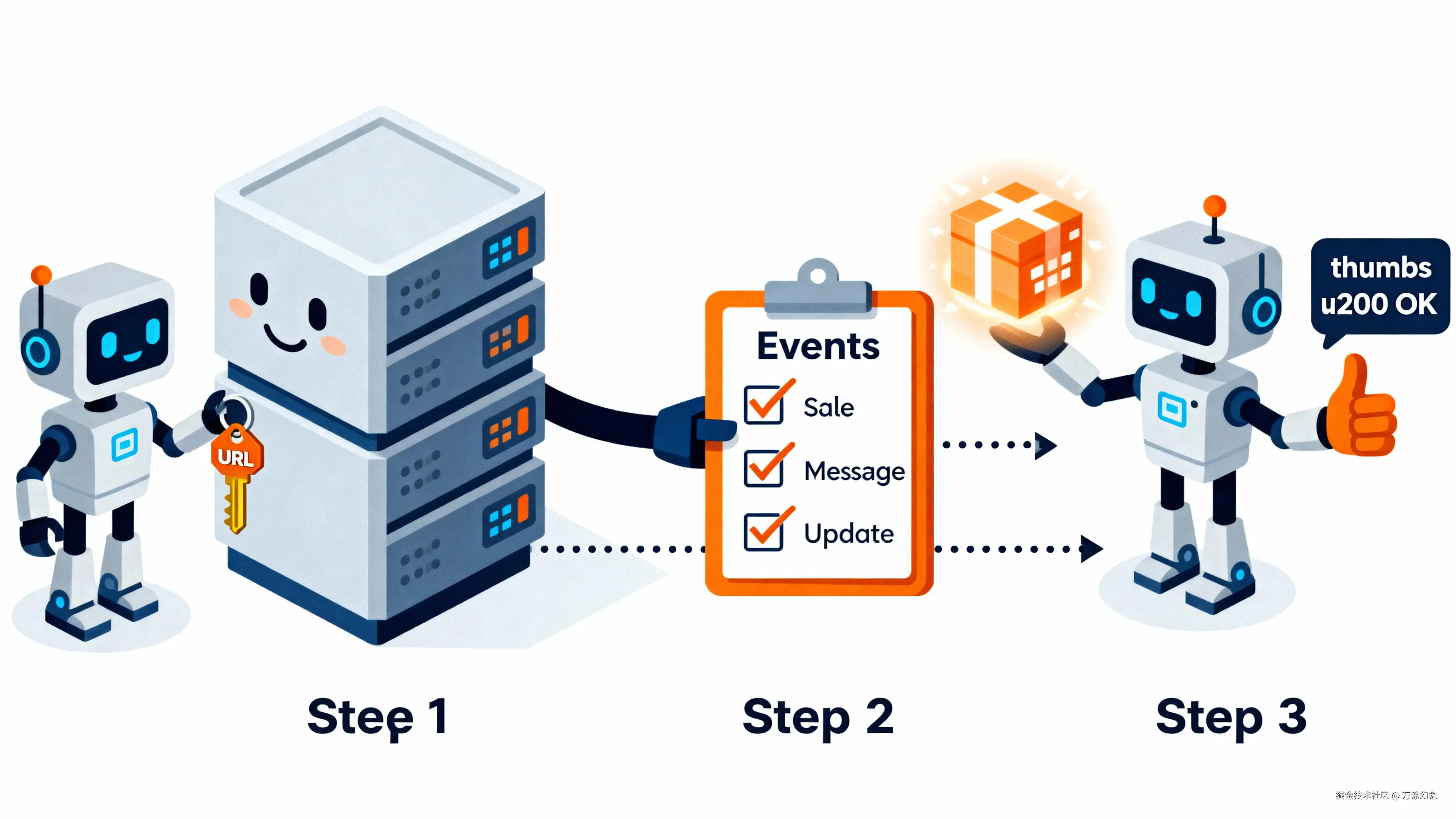 比如,客户在你的网站上付了款,支付平台(微信、支付宝)就会通过 Webhook"按一下你服务器的门铃",告诉你:"嘿,订单号 XXX 付钱了,赶紧发货!"。