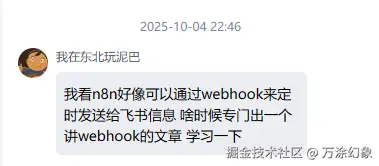 他问:"我看 n8n 好像可以通过 webhook 来定时发送给飞书信息,啥时候专门出一个讲 webhook 的文章学习一下?"
